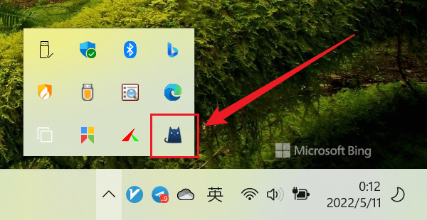 打开之后我们会在任务栏看到一个小猫咪图标,看不到的可以点开隐藏任务栏看下,如下所示: